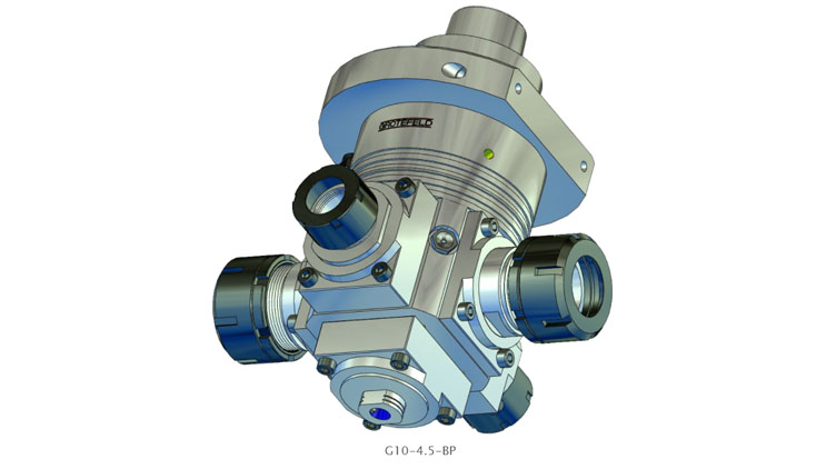 G10-4.5 系列角頭具有帶兩個刀架的連續(xù)加工主軸。這意味著兩個刀架之一的主軸旋轉(zhuǎn)方向與驅(qū)動旋轉(zhuǎn)方向相同,另一個刀架的主軸旋轉(zhuǎn)方向與驅(qū)動方向相反。其他現(xiàn)有加工主軸與連續(xù)加工主軸呈90°角布置。